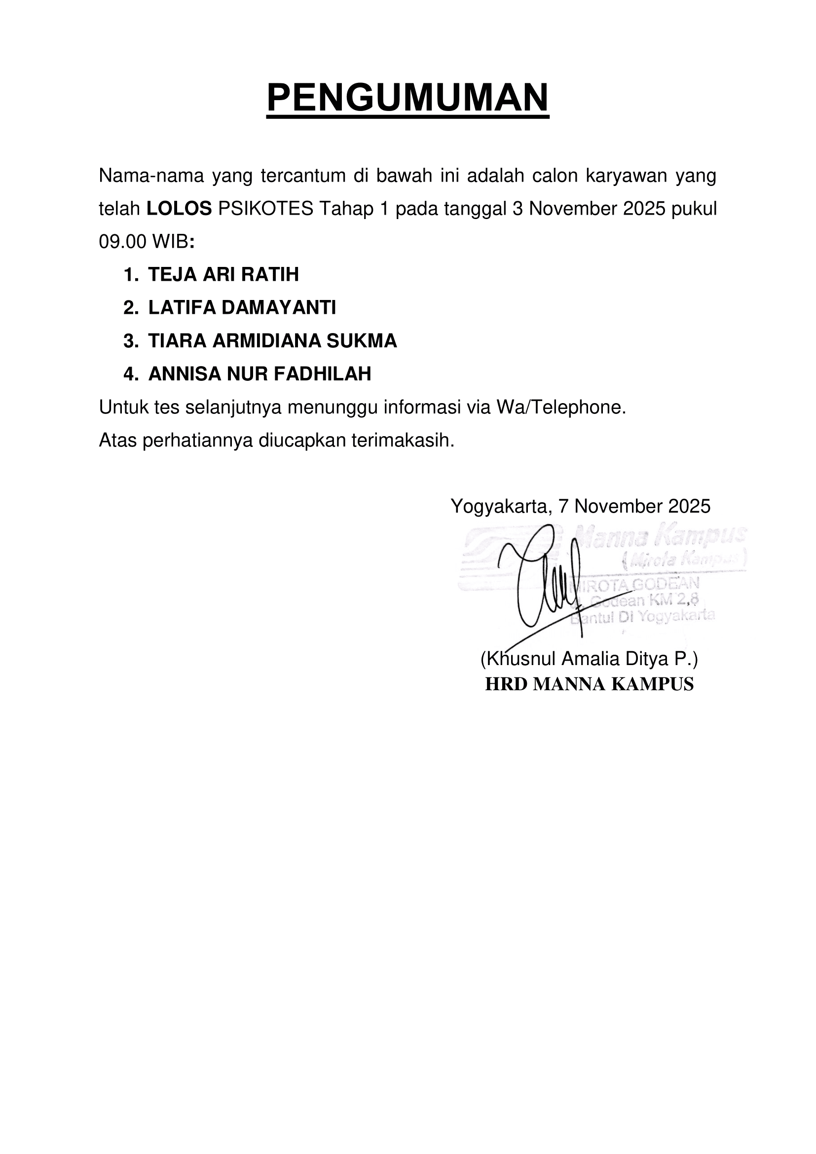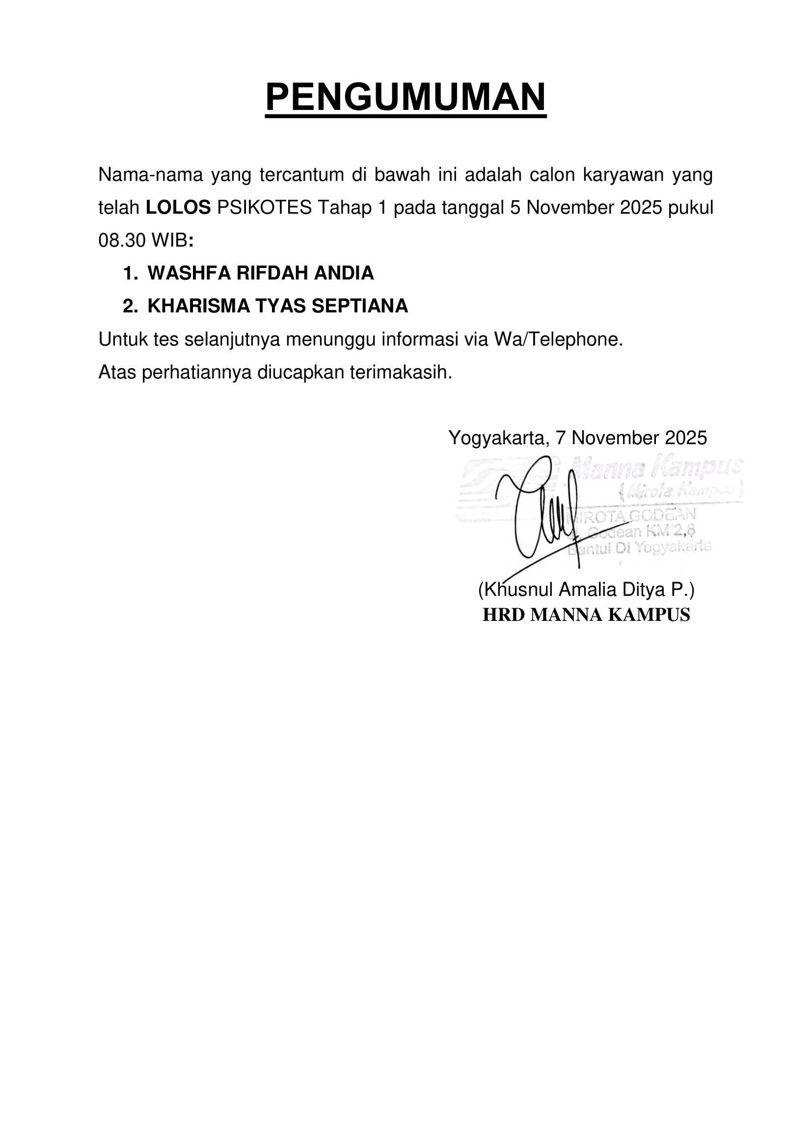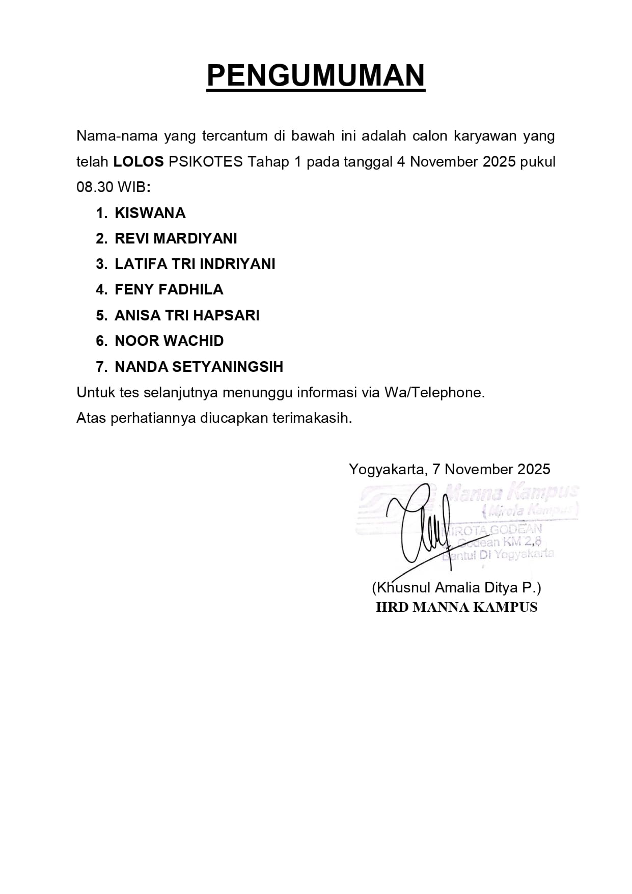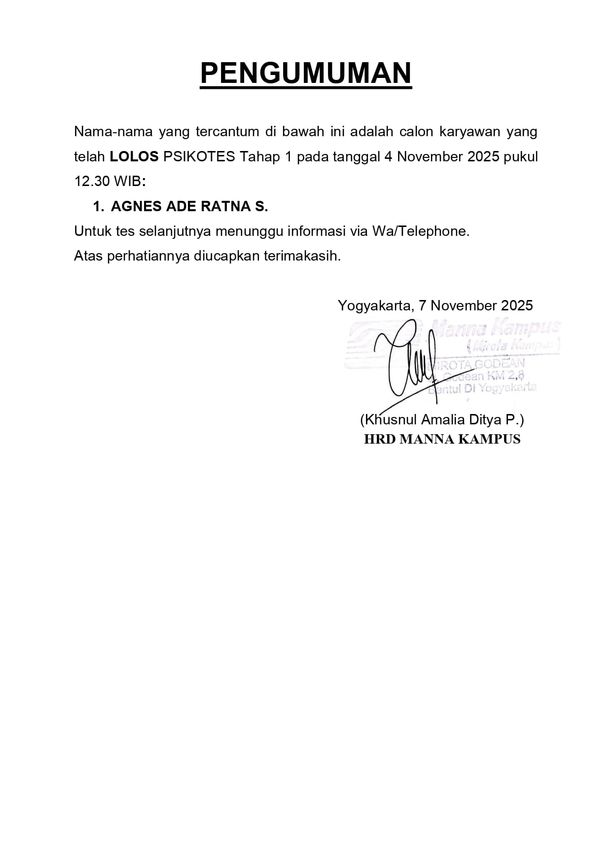 PENGUMUMAN HASIL TES TERTULIS TAHAP 1 TANGGAL 5 NOVEMBER 2025, PUKUL 08.30 WIB