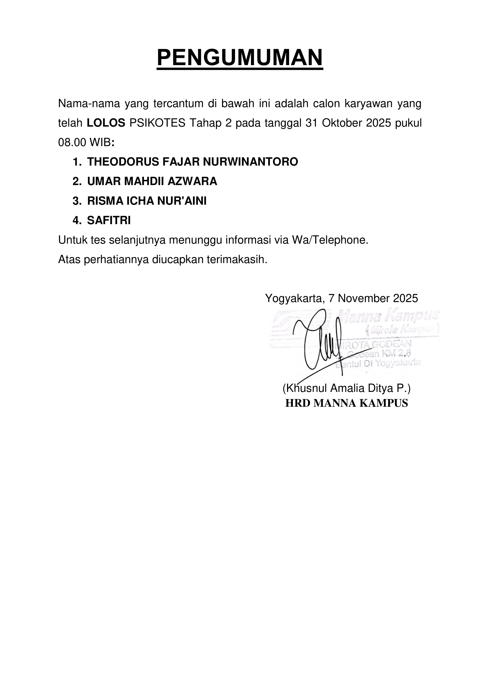 PENGUMUMAN HASIL TES TERTULIS TAHAP 2 TANGGAL 31 OKTOBER 2025, PUKUL 08.00 WIB