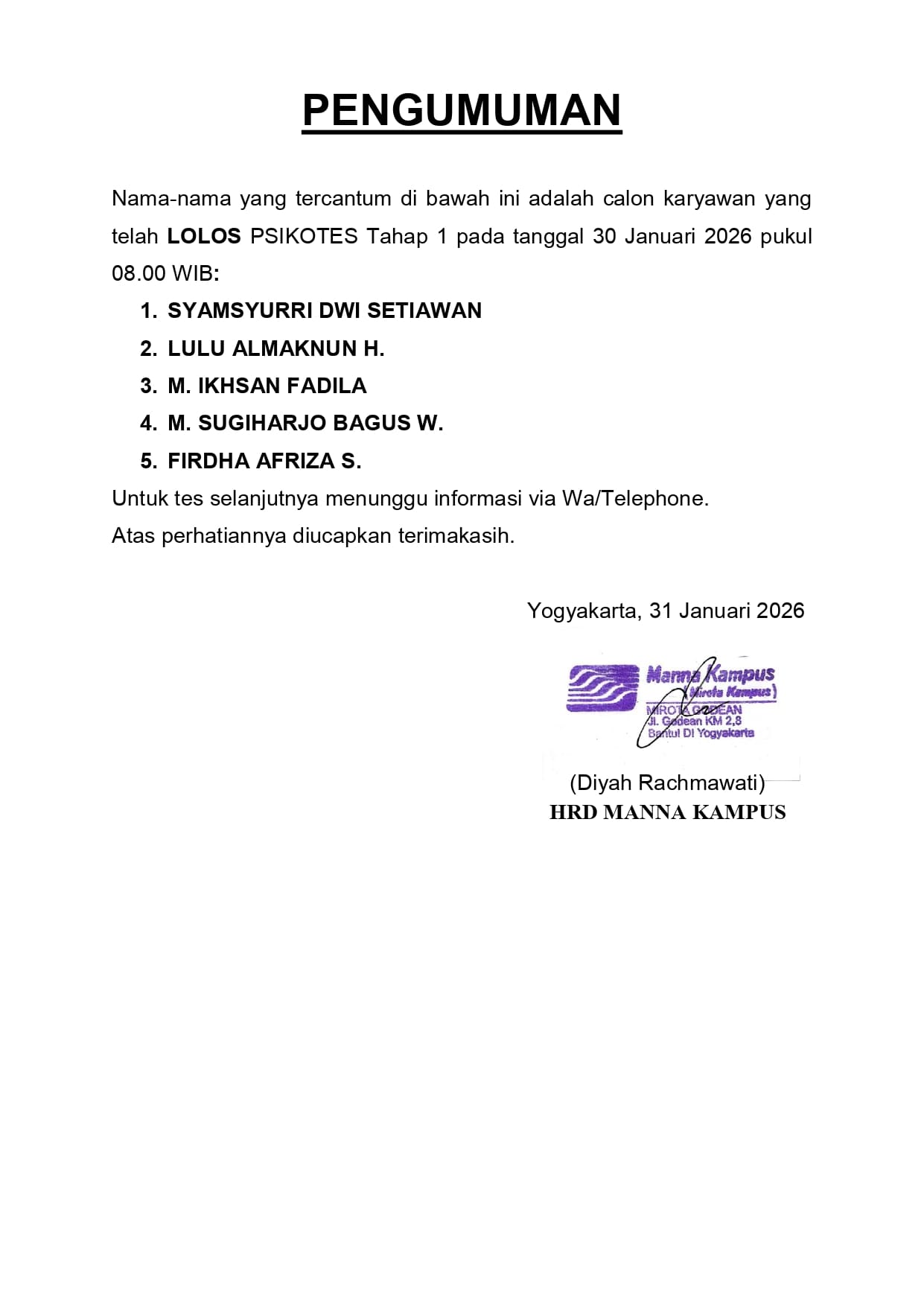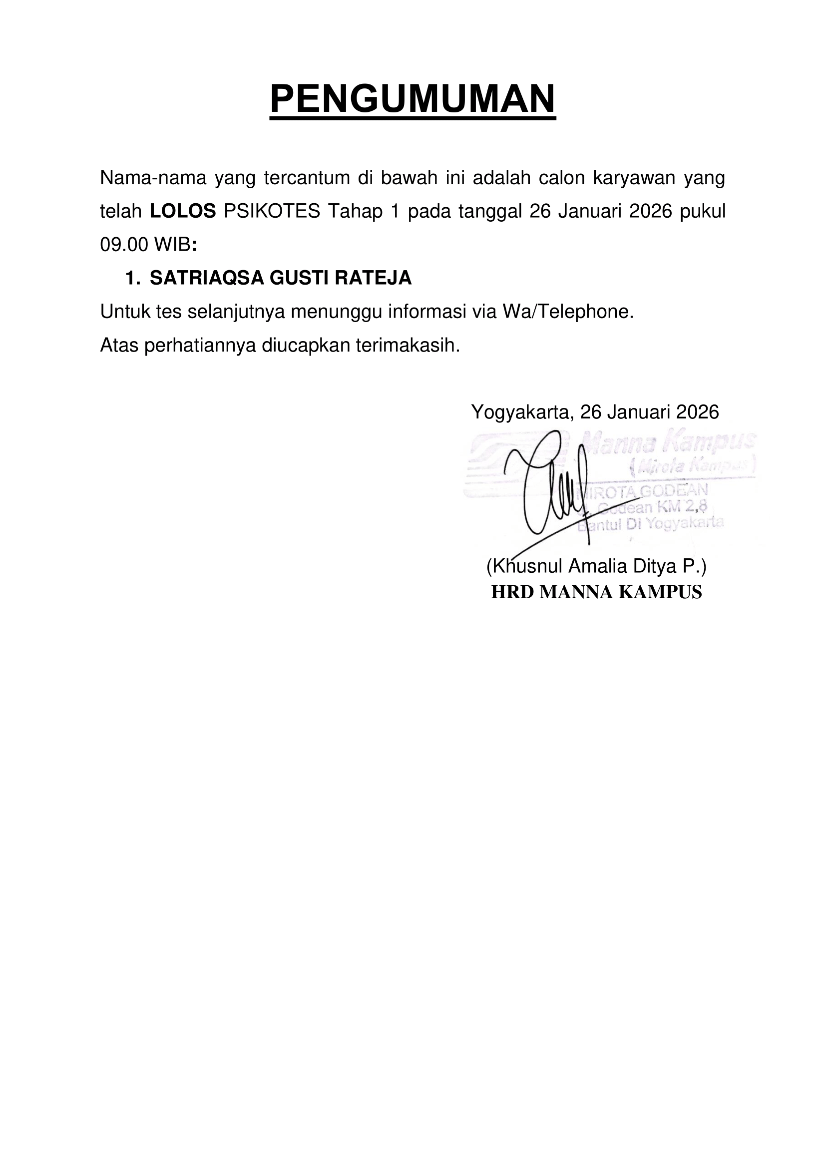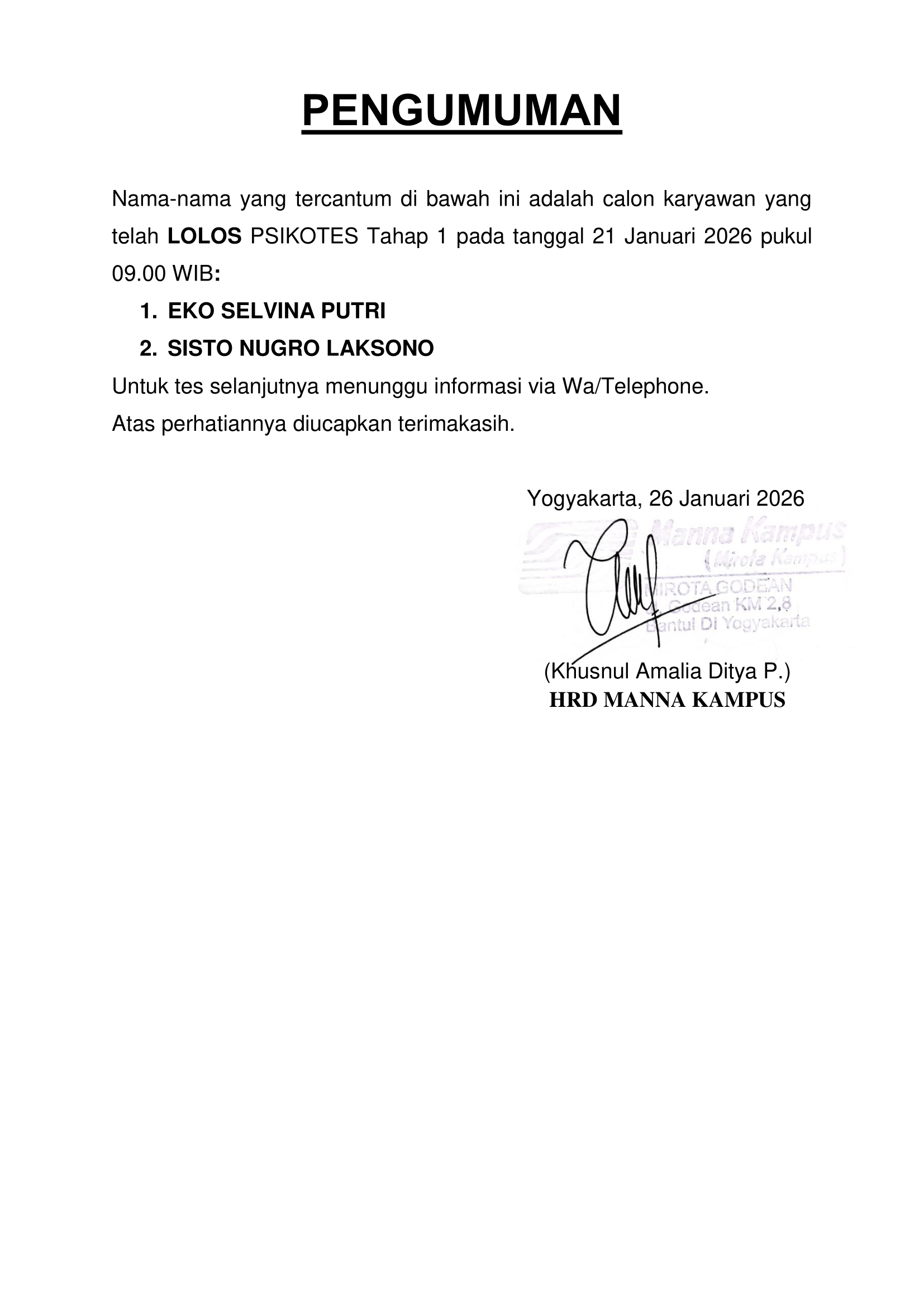 HASIL TES TERTULIS TANGGAL 21 JANUARI 2026, PUKUL 12.30