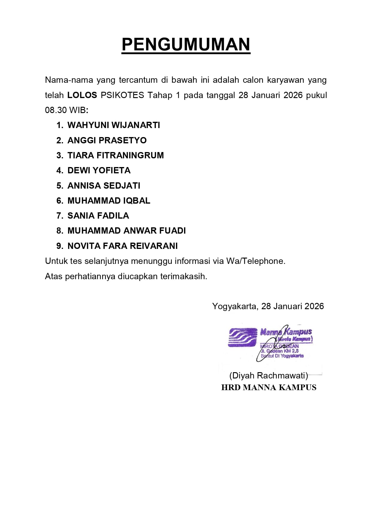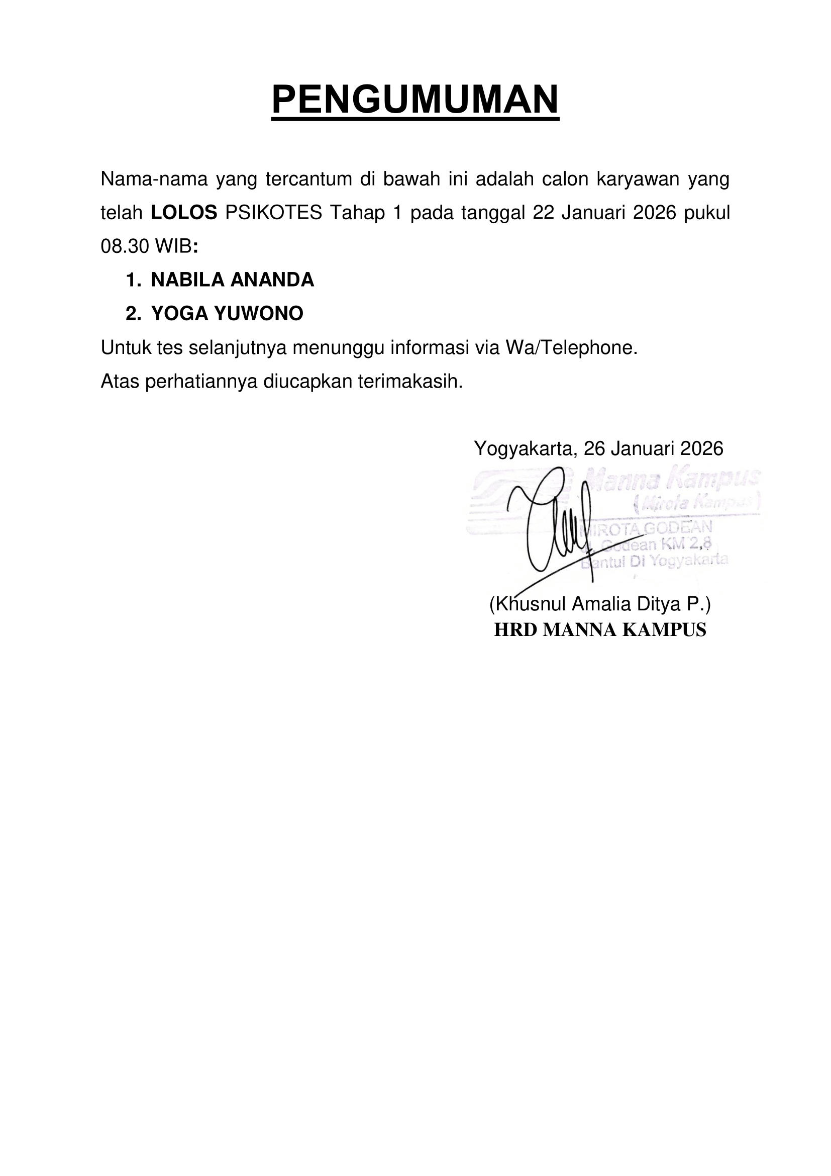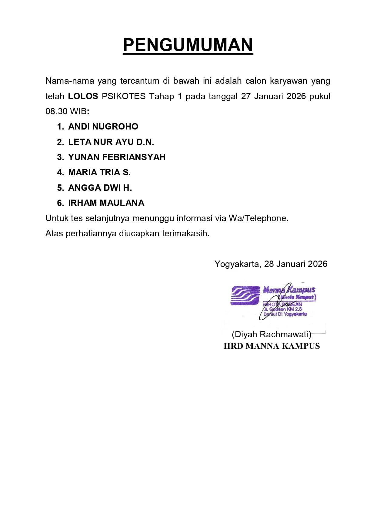 HASIL TES TERTULIS TANGGAL 21 JANUARI 2026, PUKUL 12.30