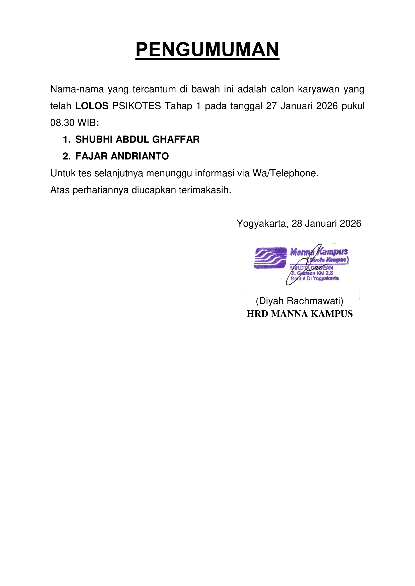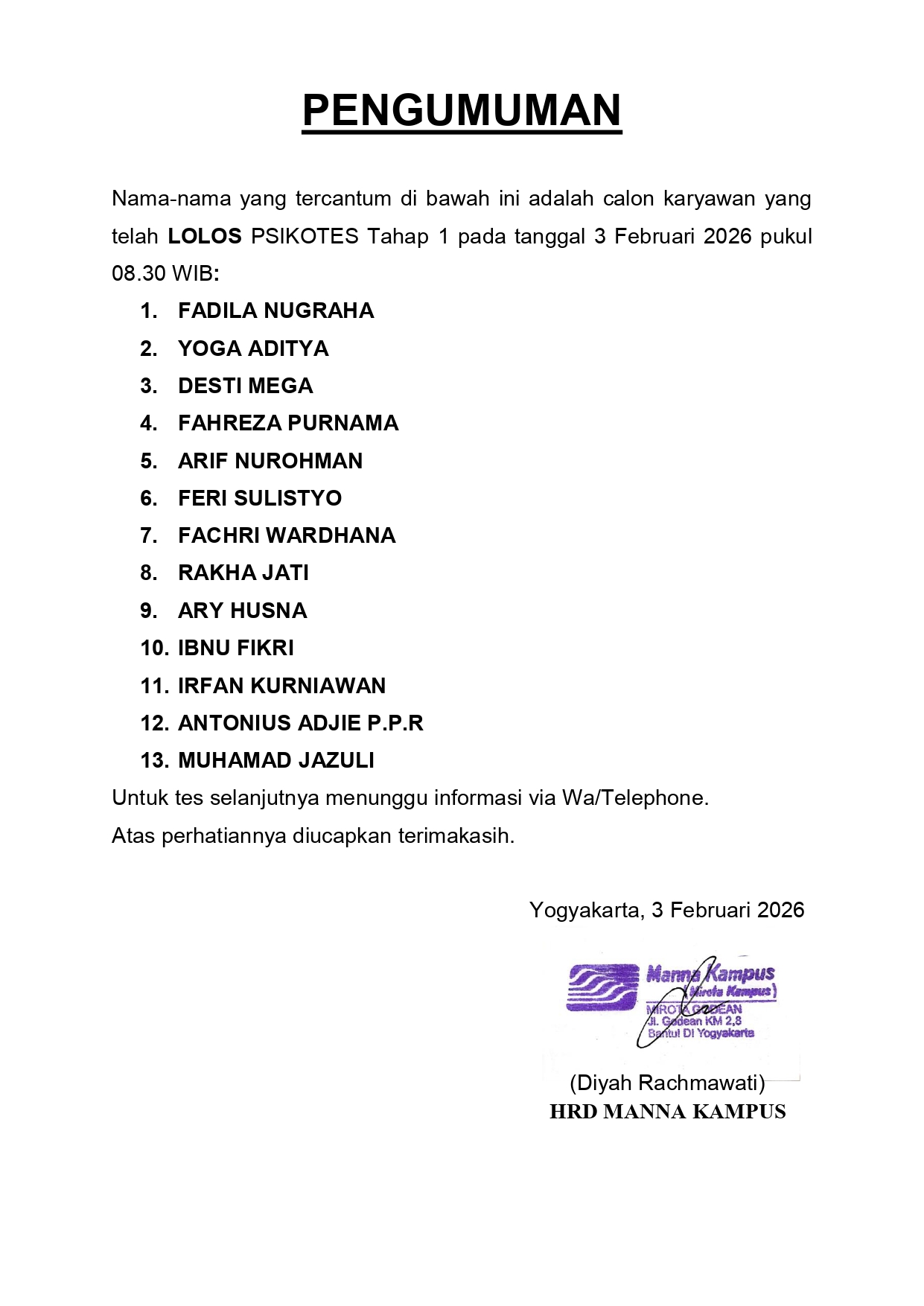 PENGUMUMAN HASIL TES TERTULIS TAHAP 1 TANGGAL 13 JANUARI 2026, PUKUL 08.30 WIB