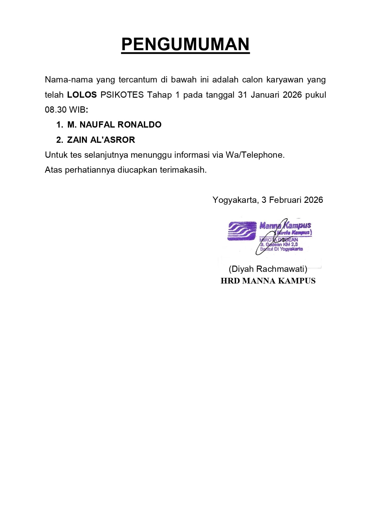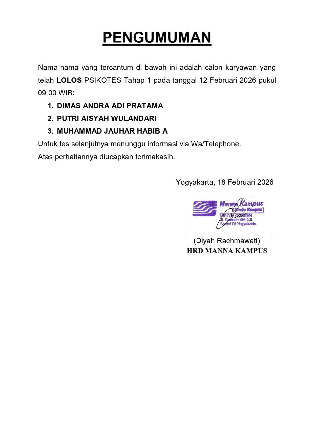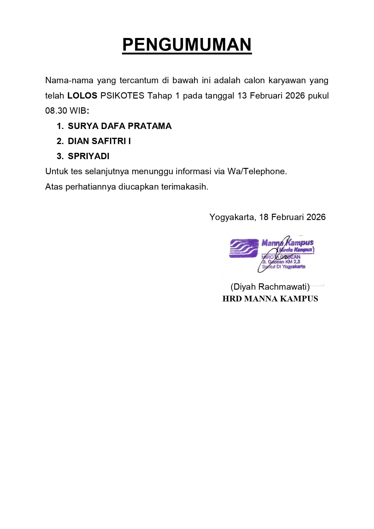 HASIL TES TERTULIS TANGGAL 3 FEBRUARI 2026, PUKUL 08.30 WIB