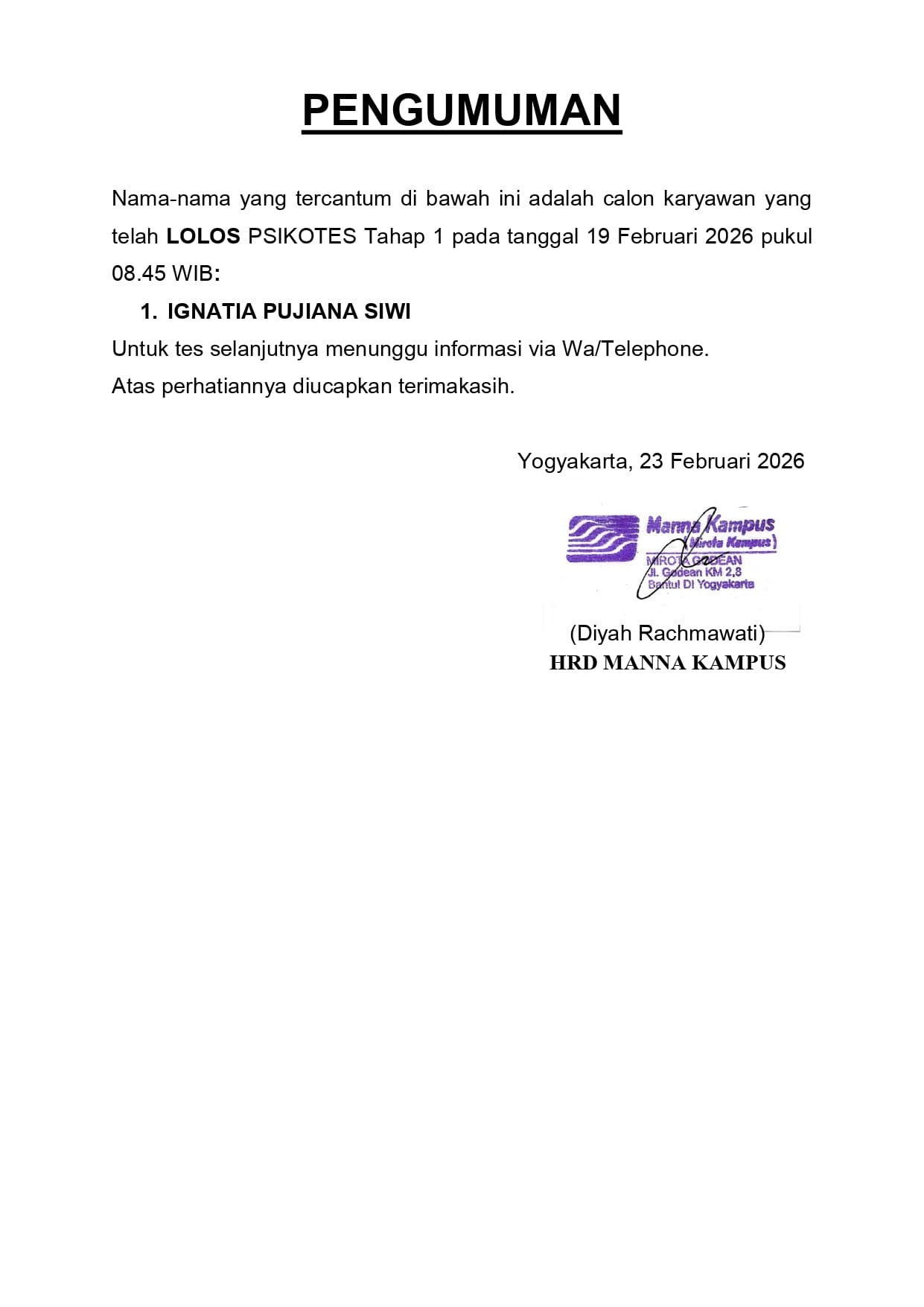 HASIL TES TERTULIS TAHAP 1 TANGGAL 19 FEBRUARI 2026, PUKUL 08.45 WIB