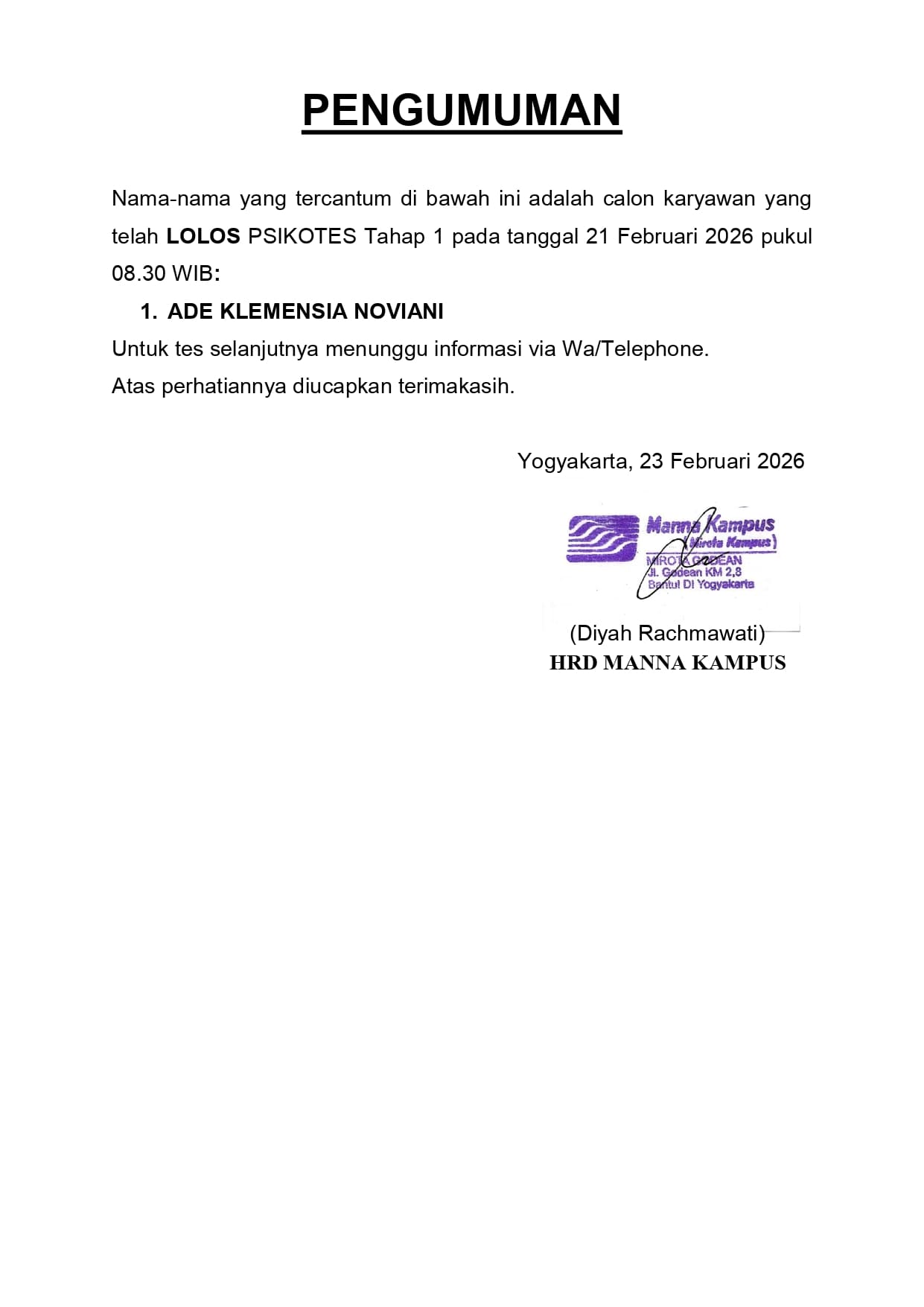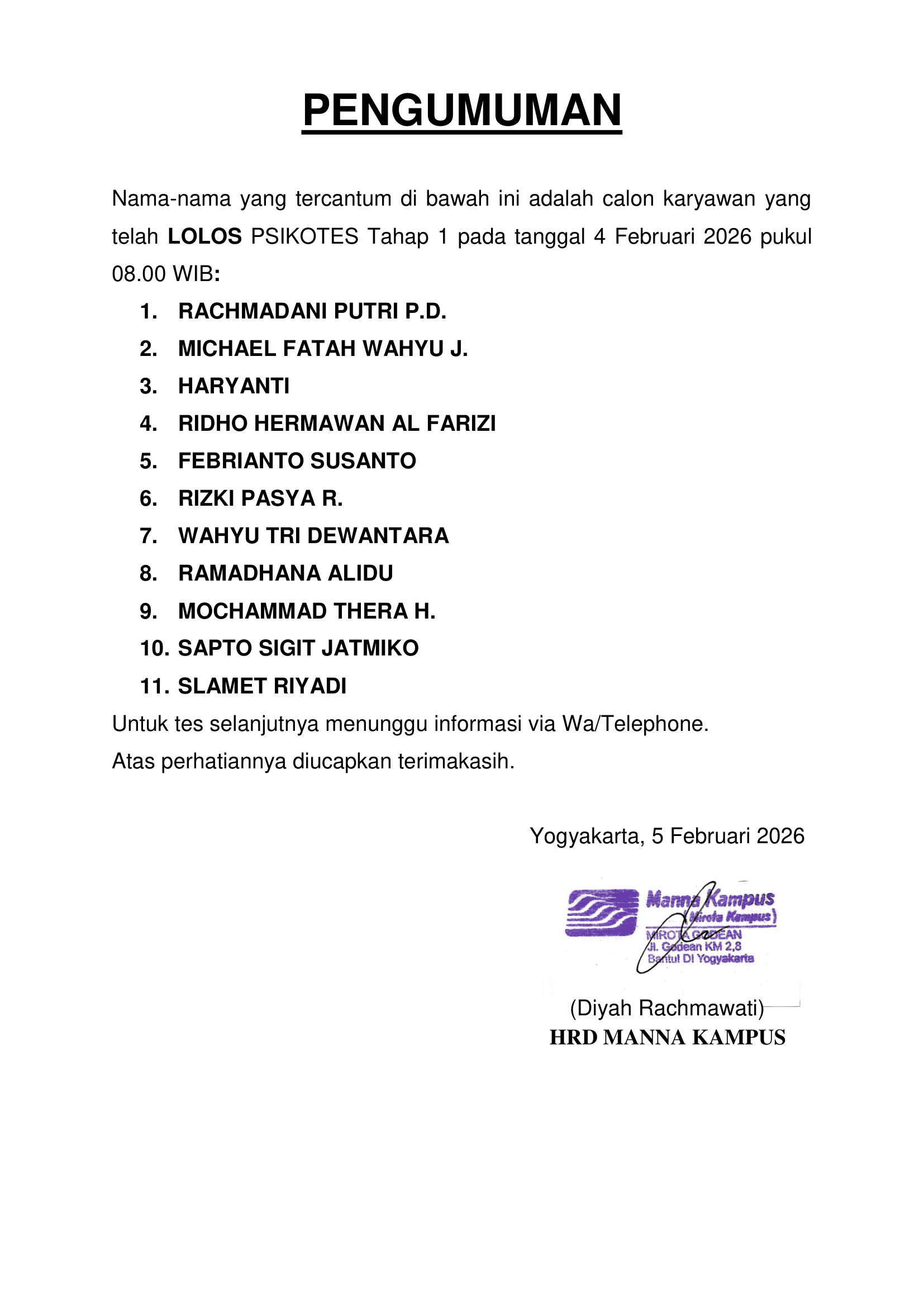 HASIL TES TERTULIS TANGGAL 11 FEBRUARI 2026, PUKUL 08.30 WIB