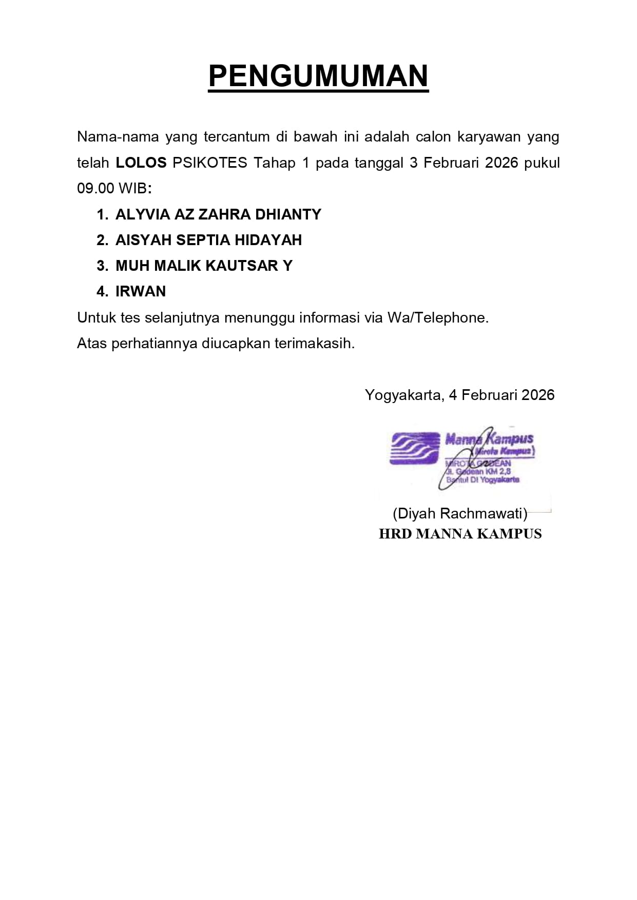 HASIL TES TERTULIS TANGGAL 4 FEBRUARI 2026, PUKUL 08.00 WIB