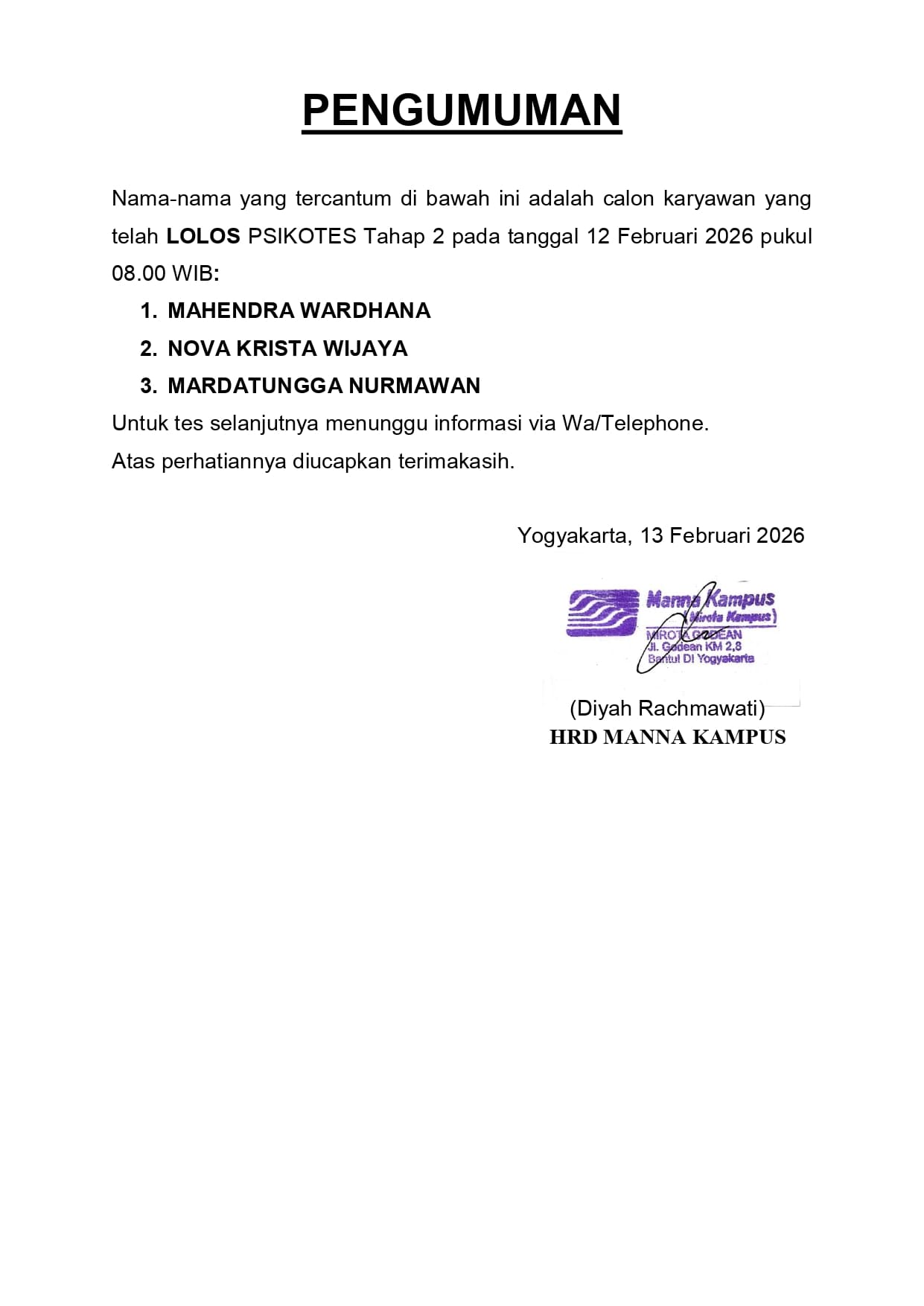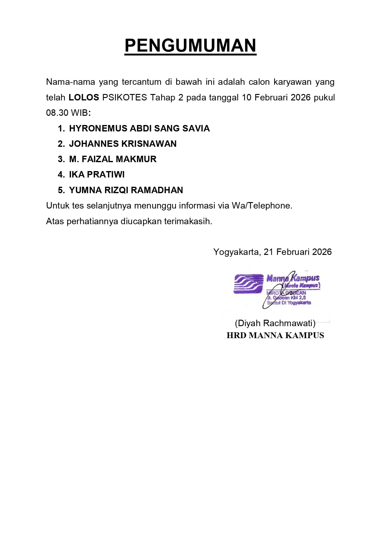 HASIL TES TERTULIS TAHAP 2 TANGGAL 12 FEBRUARI 2026, PUKUL 08.00 WIB