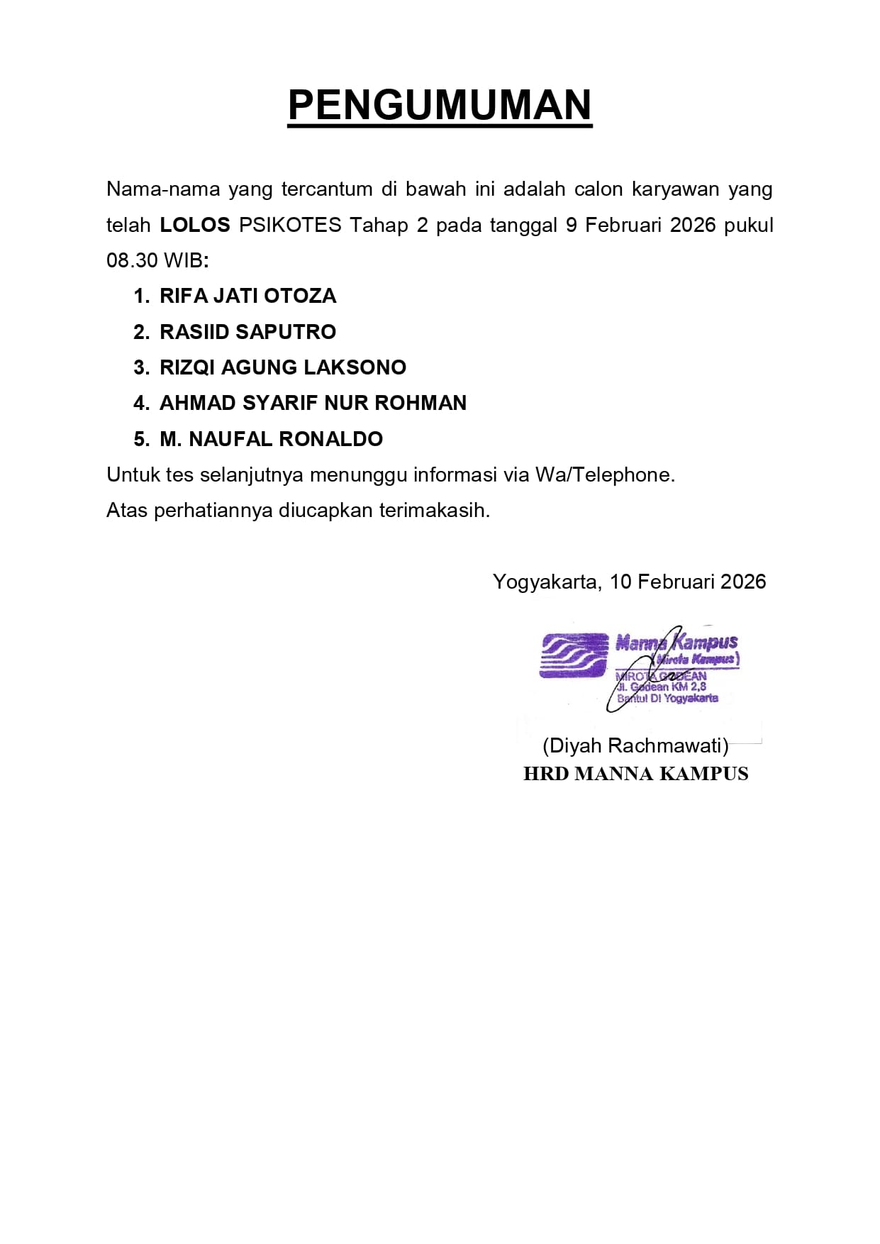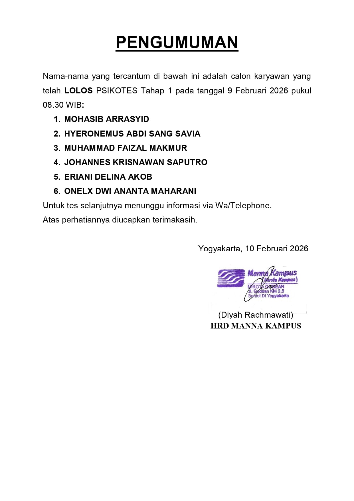 HASIL TES TERTULIS TANGGAL 9 FEBRUARI 2026, PUKUL 08.30 WIB