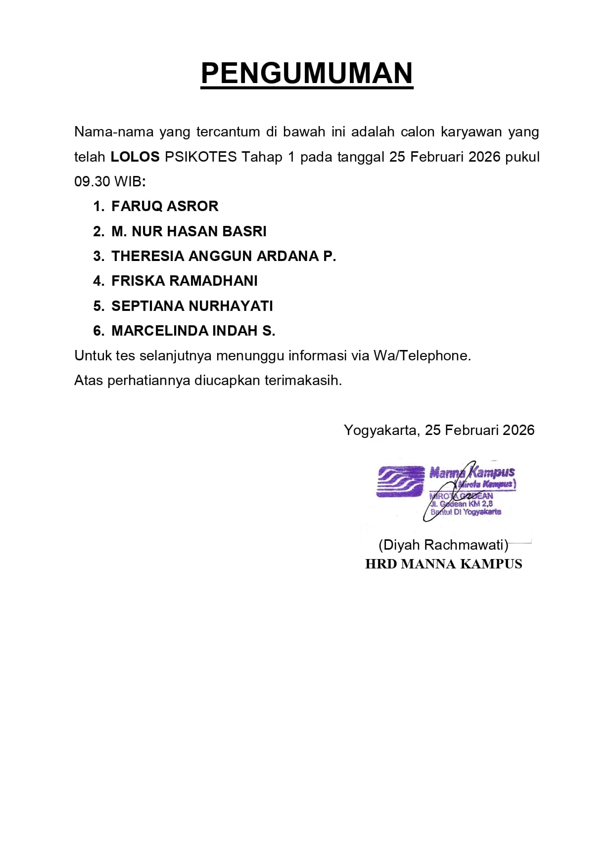 HASIL TES TERTULIS TANGGAL 25 FEBRUARI 2026, PUKUL 09.30 WIB