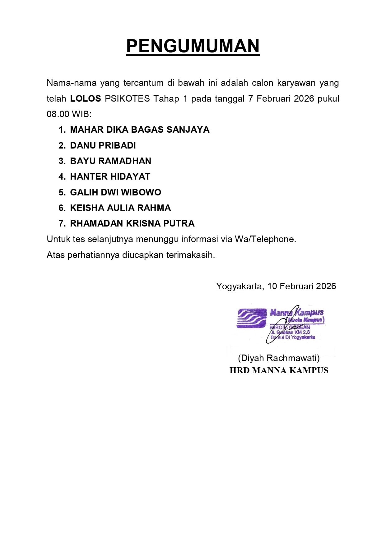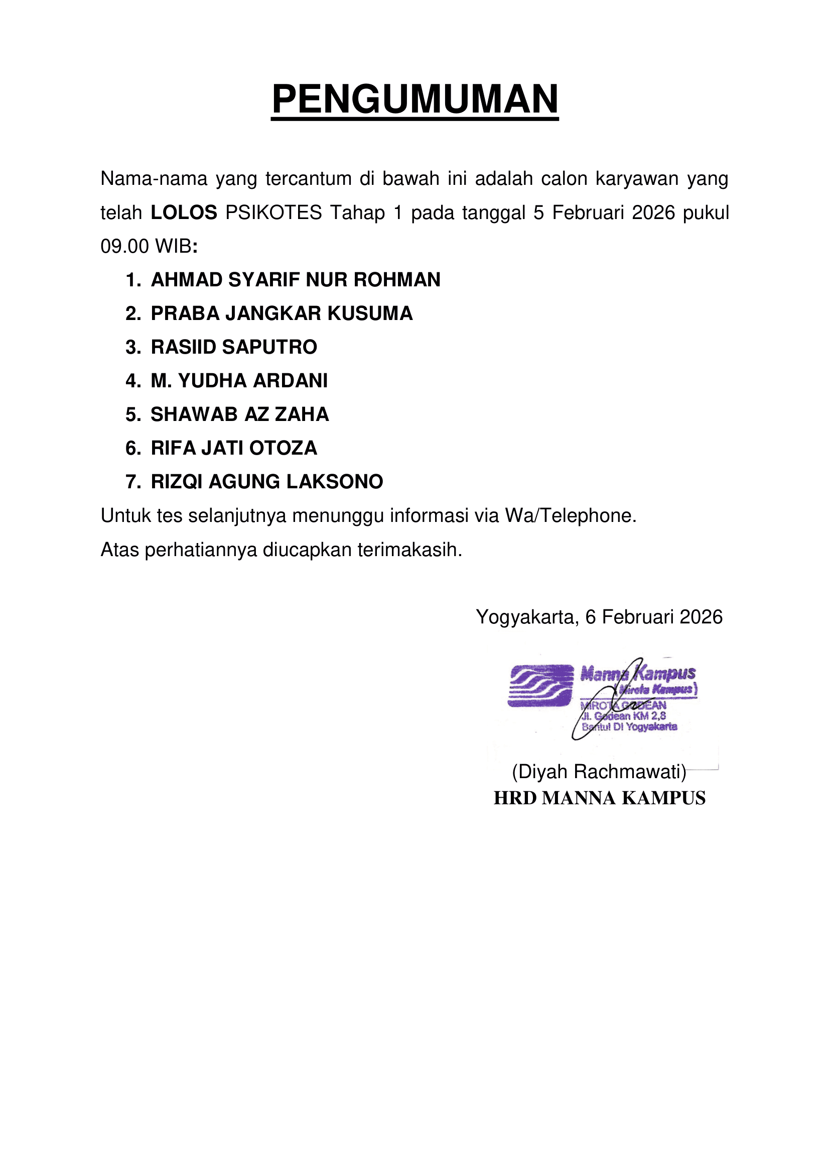 HASIL TES TERTULIS TANGGAL 7 FEBRUARI 2026, PUKUL 08.00 WIB