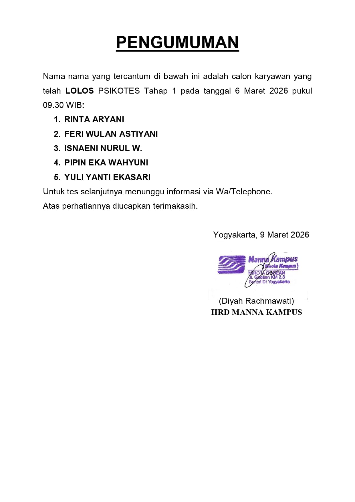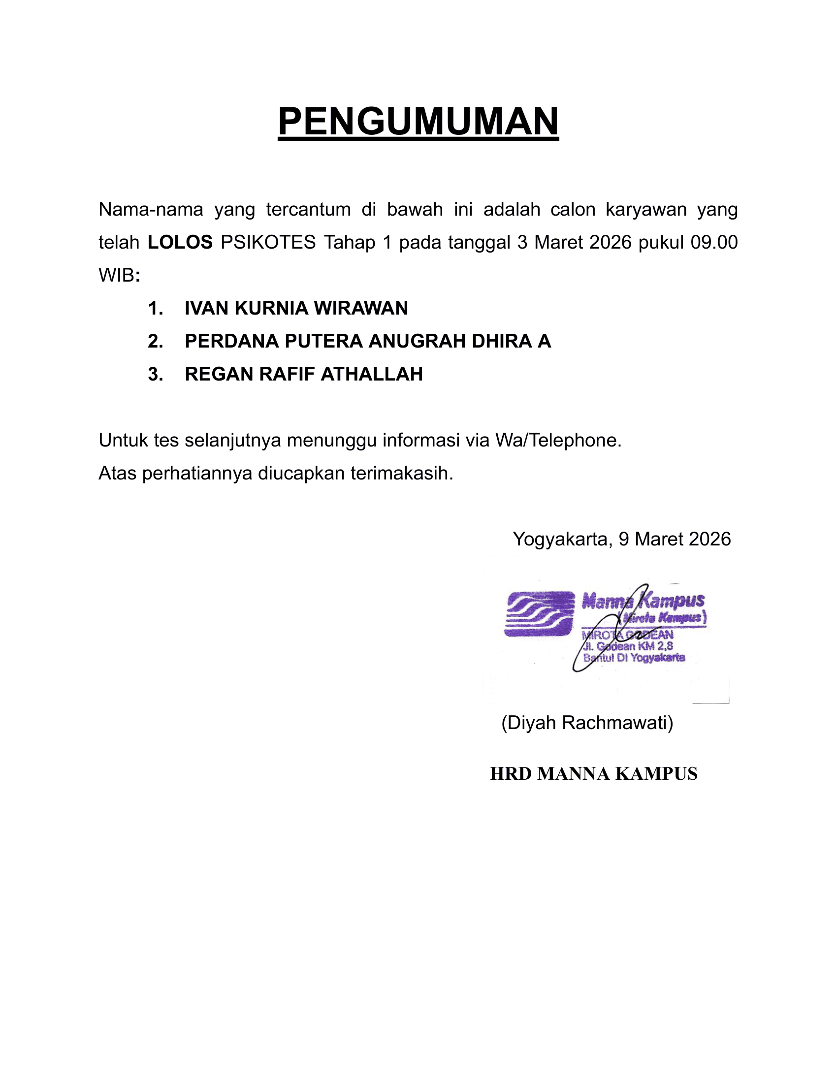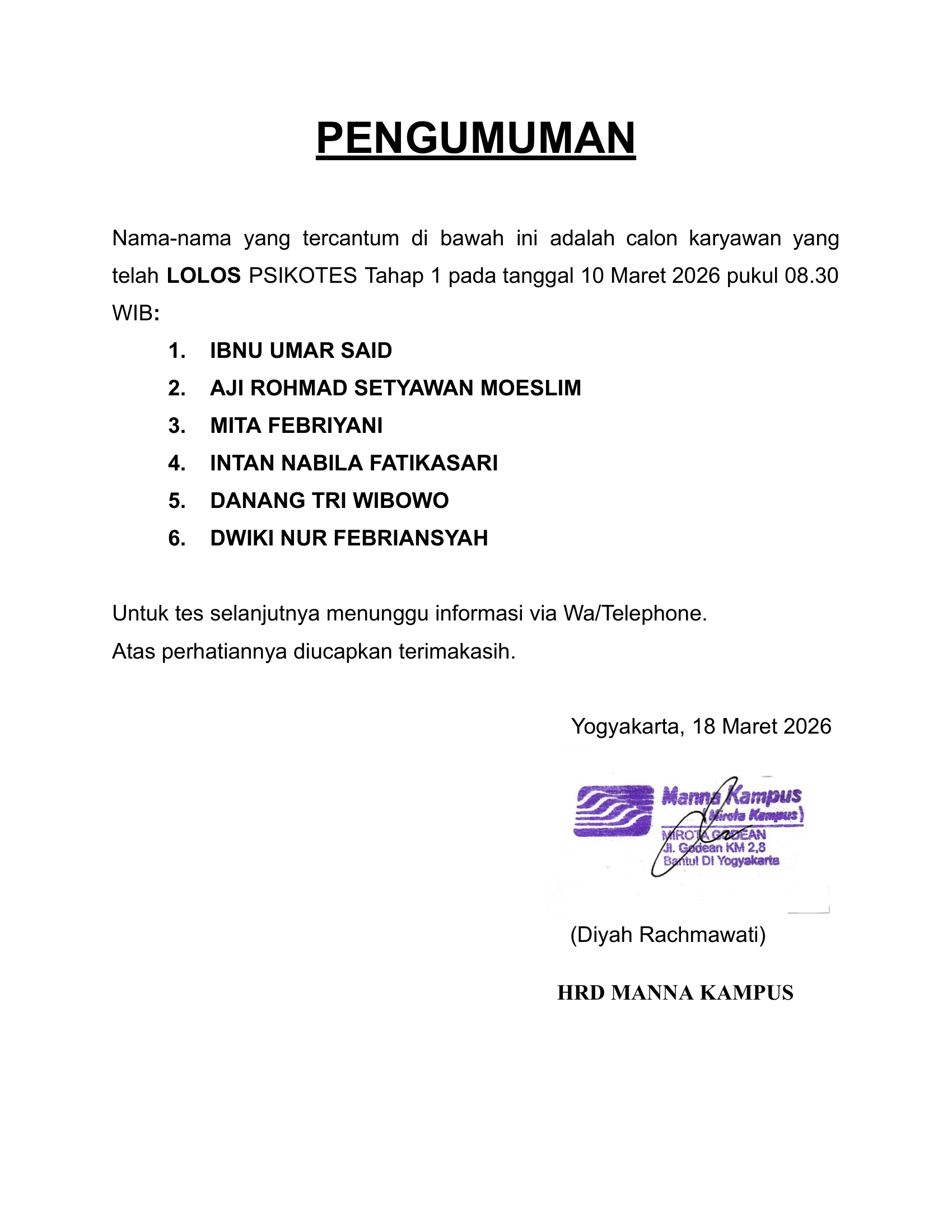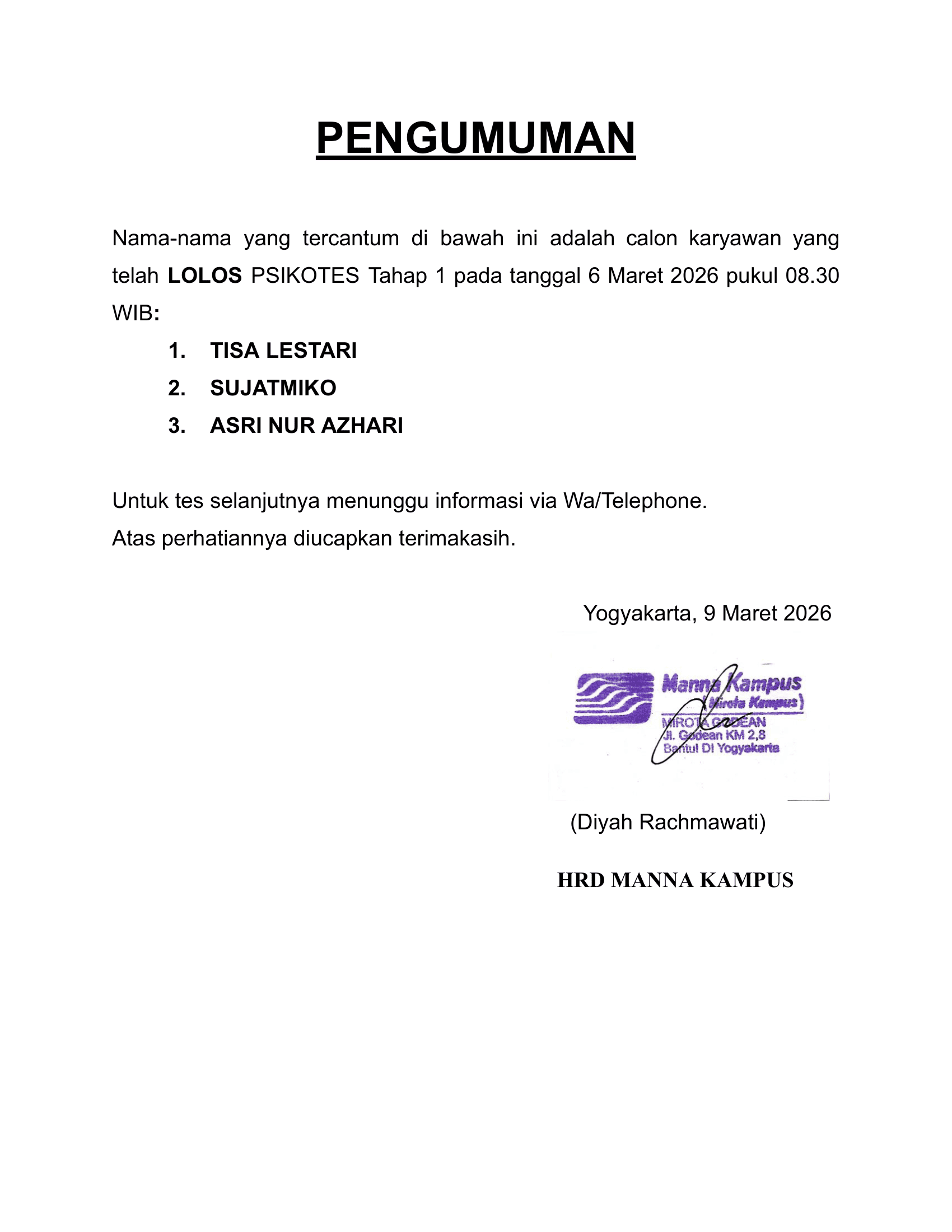 HASIL TES TERTULIS TANGGAL 6 MARET 2026, PUKUL 09.30 WIB