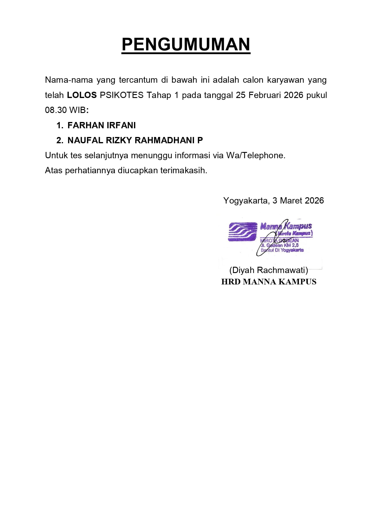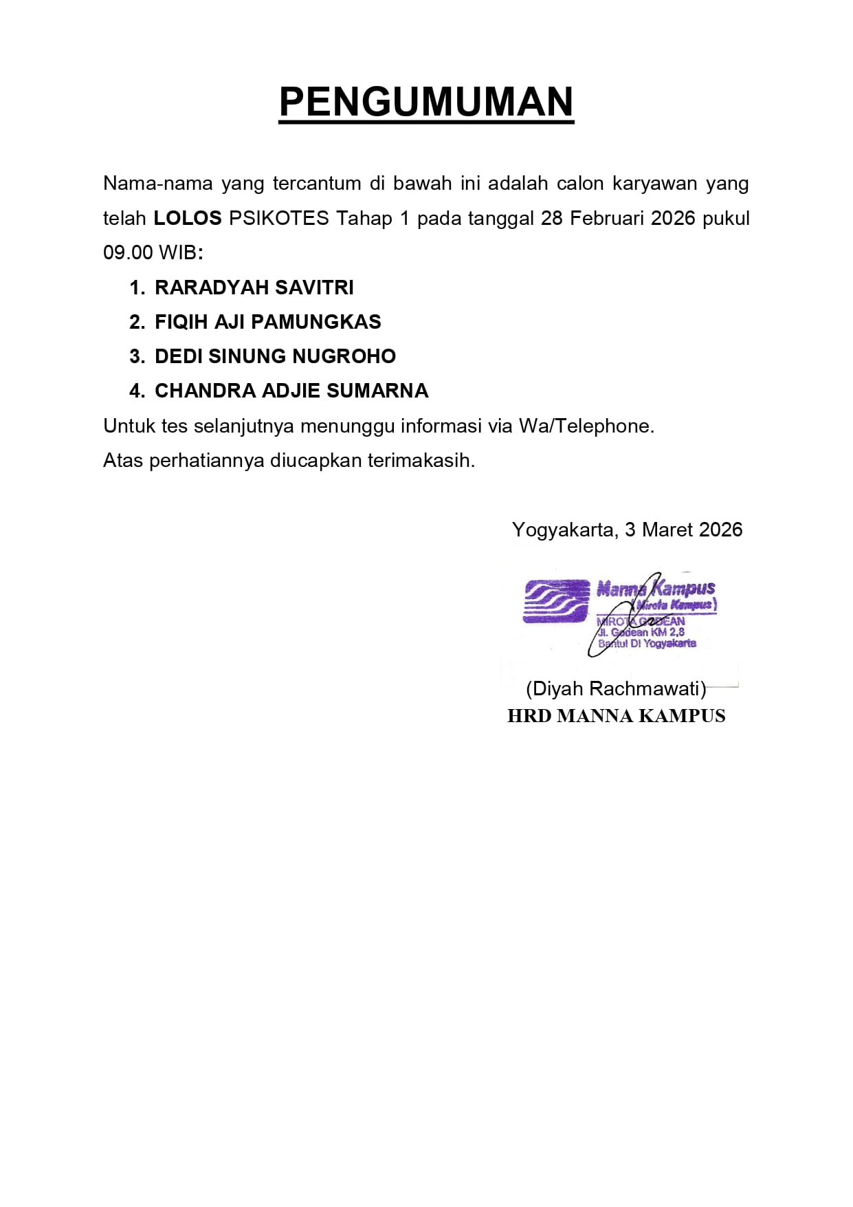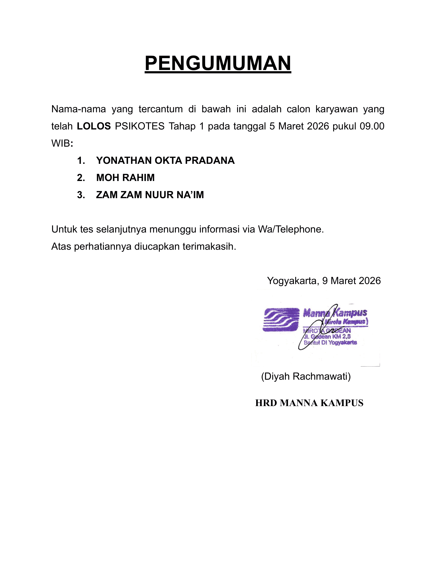 HASIL TES TERTULIS TAHAP 1 TANGGAL 05 MARET 2026 PUKUL 09.00