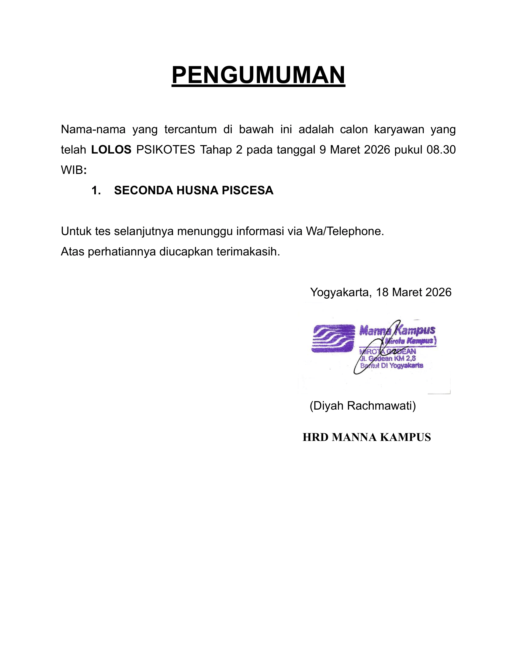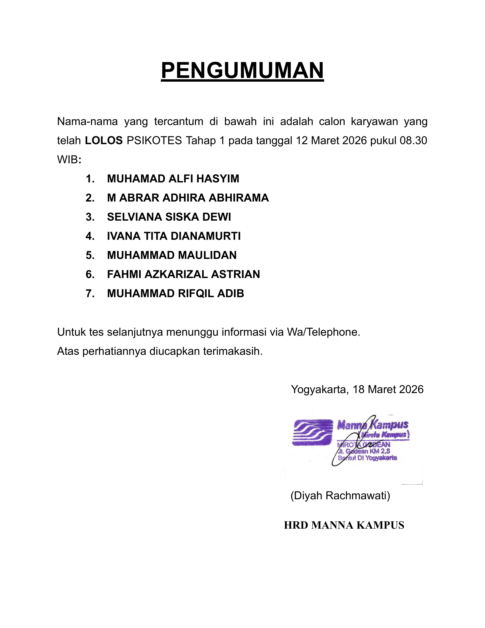 HASIL TES TERTULIS TAHAP 1 TANGGAL 12 MARET 2026 PUKUL 08.30