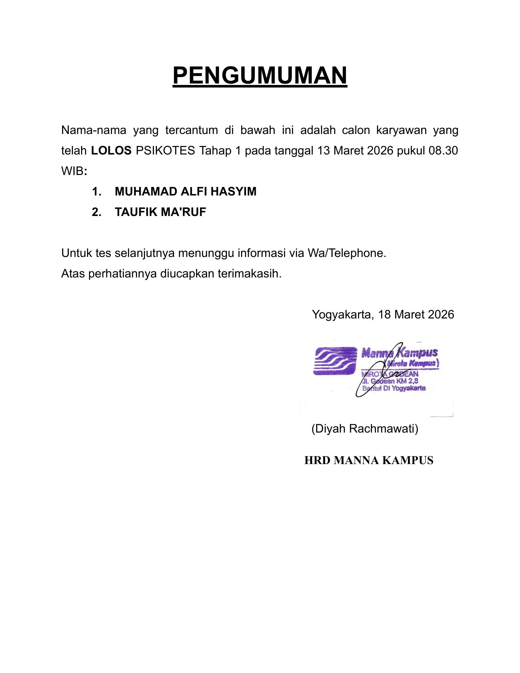HASIL TES TERTULIS TAHAP 1 TANGGAL 13 MARET 2026 PUKUL 08.30